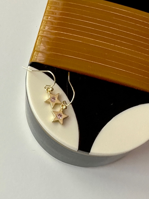 Aros con forma de estrella con un cubic zirconia central engarzado de color rosa. El pasante es hipoalergénico y junto con el dije están laminados en oro 18k. Medida aprox del dije 8mm x 8 mmm